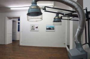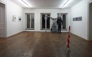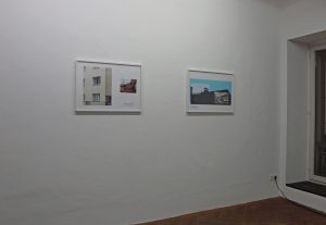 The work Armchair pedestal – COVID19 lockdown (2020) consists of two photos, one shows an elderly person sitting on an elevated armchair, looking out of the window. Second photo shows the exterior view of the house – the pedestal is not only enabling the sight out, it also makes the observer visible in public. For Hofgang mit Foucault (2009/2020) the artist erected a five meter black and white portrait of Michel Foucault on top of a hill next to Austrias biggest prison. It is the only spot the inmates can see from the prison court, one photo shows the inmates from Foucault` perspective, the other constructs the perspective of the inmates over the prison wall.