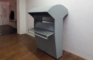 Kolping Kiste (2020) is an object designed to sit on top of a donation dropbox for clothes, imitating its hatch mechanism. Dropped items fall into a separate chamber which can be opened by a key. It is made out of plywood and metal, the workmanship is rather poor -nevertheless after being installed in public space it is accepted by donators. The video Kolping Kiste shows activities around a dropbox for old clothes in Vienna, before and after attaching the fake portal on top. People are often concerned if their donations are getting in the right hands, therefor minimum caution in the process of donating is required. Kolping kiste appears as a device that might tackle the problem of unauthorized withdrawal, but could also raise suspicion of who is benefiting- the video shows the artist emptying the attached box under favor of darkness, it remains unclear what happened with the avalanche of old clothes.