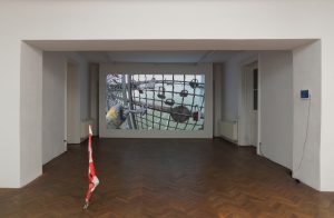 For his show Ral 9006 the artist presents a selection of recent works. Based on unannounced interventions in public space videos, objects and interactive installations materialize in the exhibition space. Ral 9006 (2019) refers to the color shade of a bridge railing in Vienna. The artist films himself renewing the paint, scattered locks hanging on the railing are painted as well. As the number of locks increases the brushstrokes become more hectic, priorities seem to shift: to tackle the amount of locks becomes the actual challenge, complicated by the fact the artist can only use one hand as he is holding the camera with the other. Viewer of the video share the perspective of the painter, they become hostages of his painful thoroughness. The brutality of the video lies in the imbalance between the single brush and the sheer number of locks, each one representing a young couple. The individualty of the lovelocks in color, shape and engravings is erased, but as compensation they become part of the public infrastructure. Protected by the same layer of varnish.