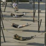 Artist connects existing rowing machine and hammocks with an orange rope.