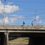 Orange balloons were handed out to pedestrians on one side of a bridge, turquoise balloons on the other side.