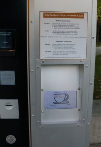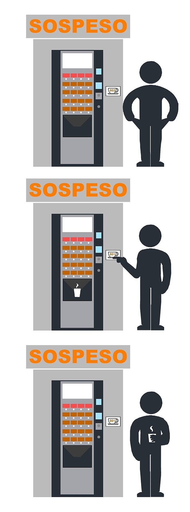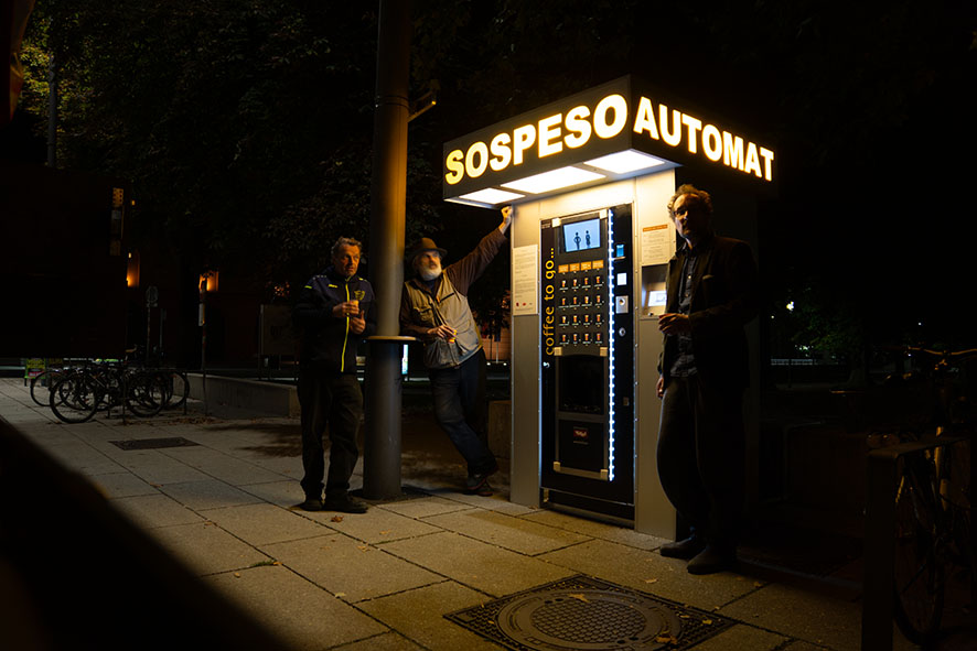 Café Sospeso is a tradition from Italy: customers can pay for an additional coffee (or several) in the café. These are noted and served to those in need on request. The „Sospeso machine“ is an experiment: does the principle work without interpersonal contact?